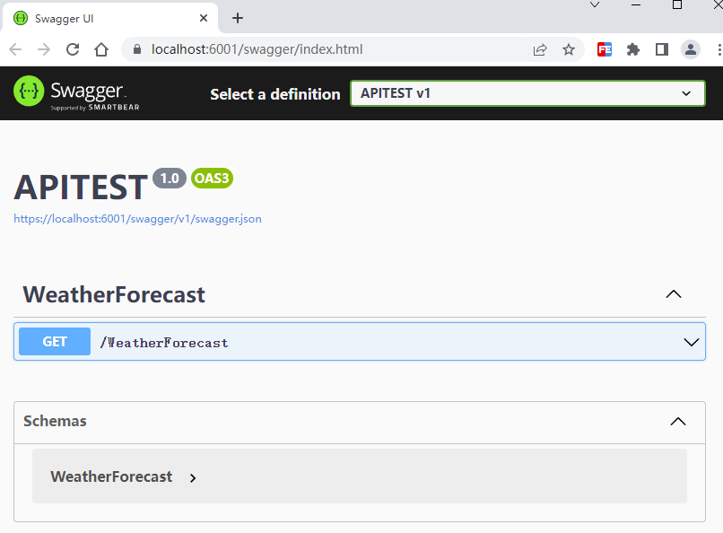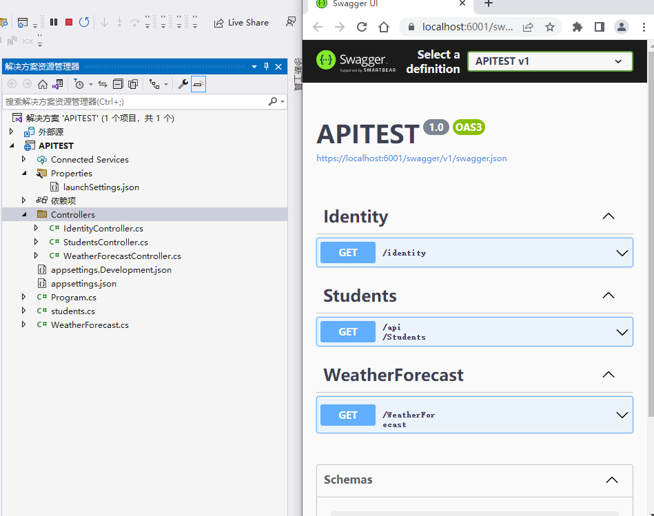 注意,狀態(tài)碼200,并未在上面界面顯示出來。說明我們的接口做好了。接下來,除了天氣預(yù)報,我們再加兩個測試接口進(jìn)去,一個是官方的Identity,一個是我們自己寫的測試接口Students,多放幾個接口是為了測試我們的權(quán)限。