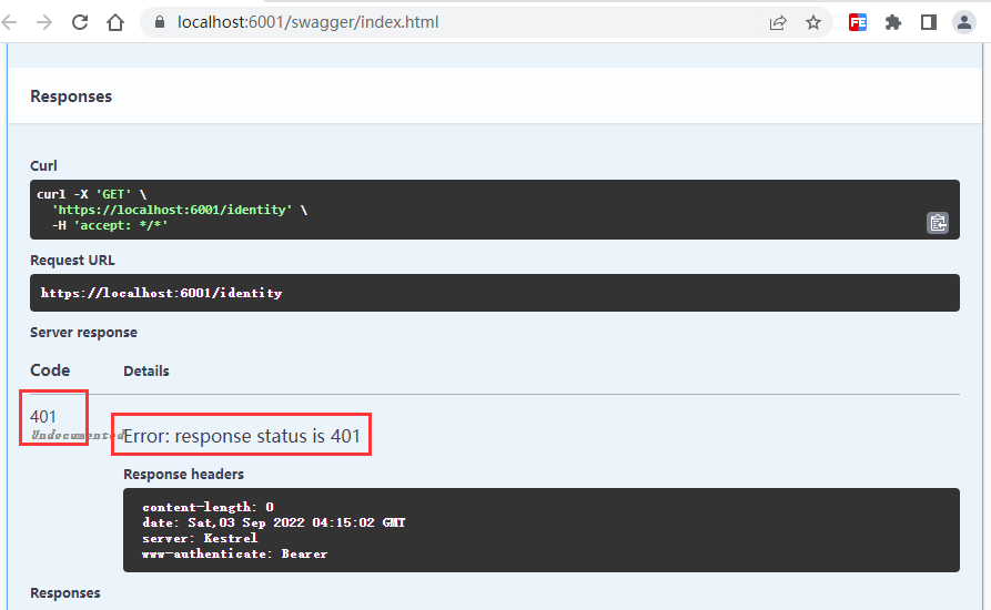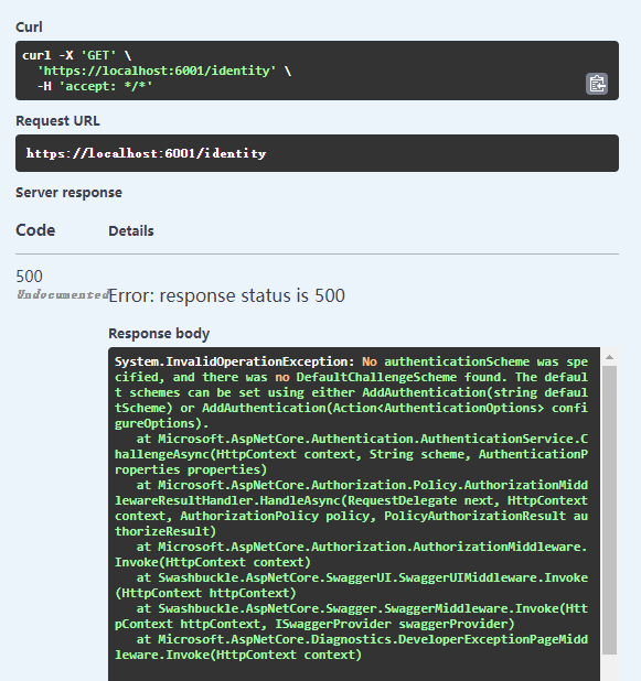 System.InvalidOperationException: No authenticationScheme was specified, and there was no DefaultChallengeScheme found. The default schemes can be set using either AddAuthentication(string defaultScheme) or AddAuthentication(Action<AuthenticationOptions> configureOptions). at Microsoft.AspNetCore.Authentication.AuthenticationService.ChallengeAsync(HttpContext context, String scheme, AuthenticationProperties properties) at Microsoft.AspNetCore.Authorization.Policy.AuthorizationMiddlewareResultHandler.HandleAsync(RequestDelegate next, HttpContext context, AuthorizationPolicy policy, PolicyAuthorizationResult authorizeResult) at Microsoft.AspNetCore.Authorization.AuthorizationMiddleware.Invoke(HttpContext context) at Swashbuckle.AspNetCore.SwaggerUI.SwaggerUIMiddleware.Invoke(HttpContext httpContext) at Swashbuckle.AspNetCore.Swagger.SwaggerMiddleware.Invoke(HttpContext httpContext, ISwaggerProvider swaggerProvider) at Microsoft.AspNetCore.Diagnostics.DeveloperExceptionPageMiddleware.Invoke(HttpContext context) HEADERS ======= Accept: */* Host: localhost:6001 User-Agent: Mozilla/5.0 (Windows NT 10.0; Win64; x64) AppleWebKit/537.36 (KHTML, like Gecko) Chrome/104.0.0.0 Safari/537.36 :method: GET Accept-Encoding: gzip, deflate, br Accept-Language: zh-CN,zh;q=0.9,en;q=0.8 Referer: https://localhost:6001/swagger/index.html sec-ch-ua: "Chromium";v="104", " Not A;Brand";v="99", "Google Chrome";v="104" sec-ch-ua-mobile: ?0 sec-ch-ua-platform: "Windows" sec-fetch-site: same-origin sec-fetch-mode: cors sec-fetch-dest: empty500就是服務(wù)器錯誤,也就是說你的代碼是有問題的。為什么會報這個問題呢?從提示看,很明顯。這是因?yàn)槲覀兊慕涌谠L問需要身份驗(yàn)證才可以,而我們卻沒有給服務(wù)器指定身份驗(yàn)證方式。慶幸的一點(diǎn)是我們的IDS4與JWT是兼容的,這樣給我們代碼的移植帶來很大方便,我們現(xiàn)在來指定API資源服務(wù)器JWT的身份驗(yàn)證方式,打開program.cs,加入以下代碼: