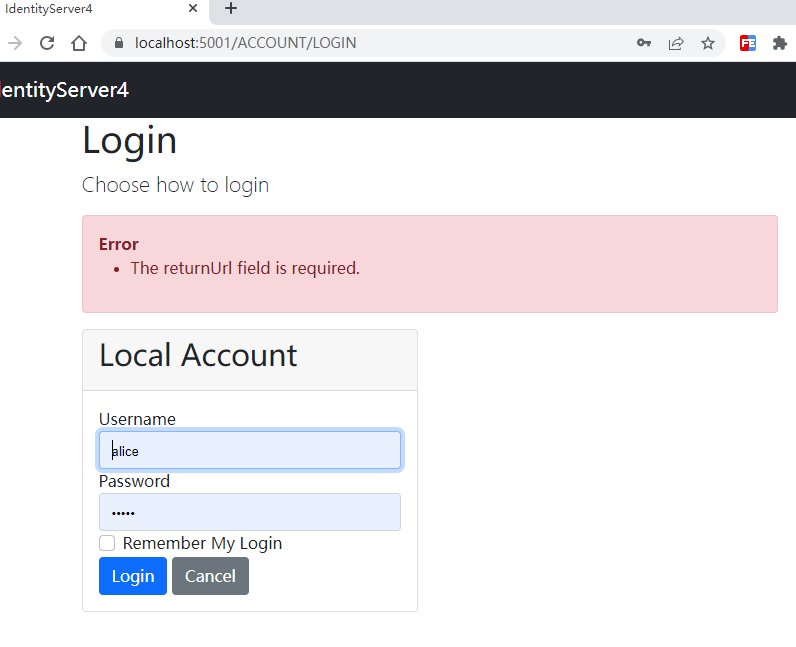 OK,大功告成!不出意外的話,我們的服務(wù)器已經(jīng)搭建好了。我們把它運(yùn)行起來,然后把我們新建的MYMVC站點(diǎn)也運(yùn)行起來,再去點(diǎn)擊WHOAMI頁面試試,發(fā)現(xiàn)被導(dǎo)航到了認(rèn)證服務(wù)器登錄頁面,注意看后面的端口后5002變成5001了,這是兩個(gè)不同的站點(diǎn)。