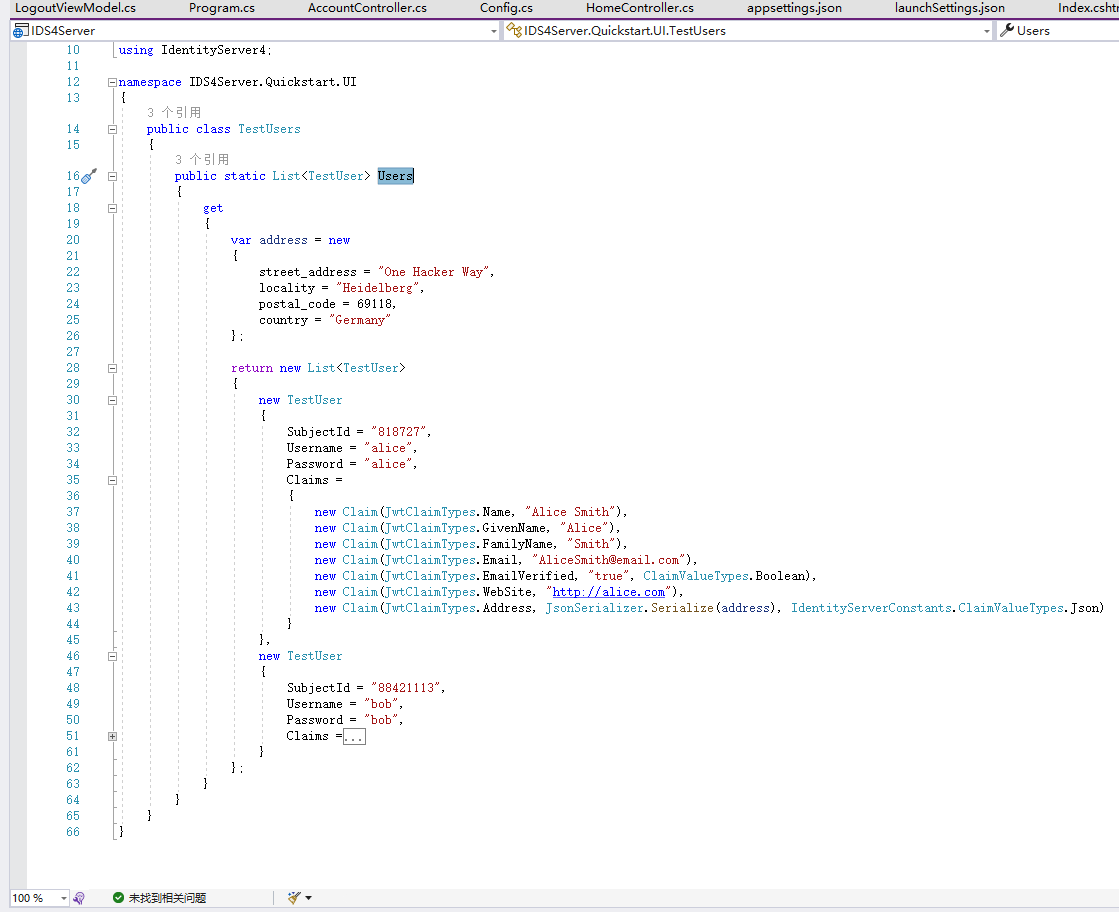官方說:示例 UI 帶有一個(gè)內(nèi)存中的“用戶數(shù)據(jù)庫”。 您可以通過添加 AddTestUsers 擴(kuò)展方法在 IdentityServer 中啟用此功能:AddTestUsers(TestUsers.Users)