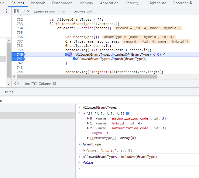 if (AllowedGrantTypes.findIndex(item=>item.id==GrantType.id && item.name==GrantType.name) < 0) { //用這種方法去查找比較保險(xiǎn),若不存在,則push