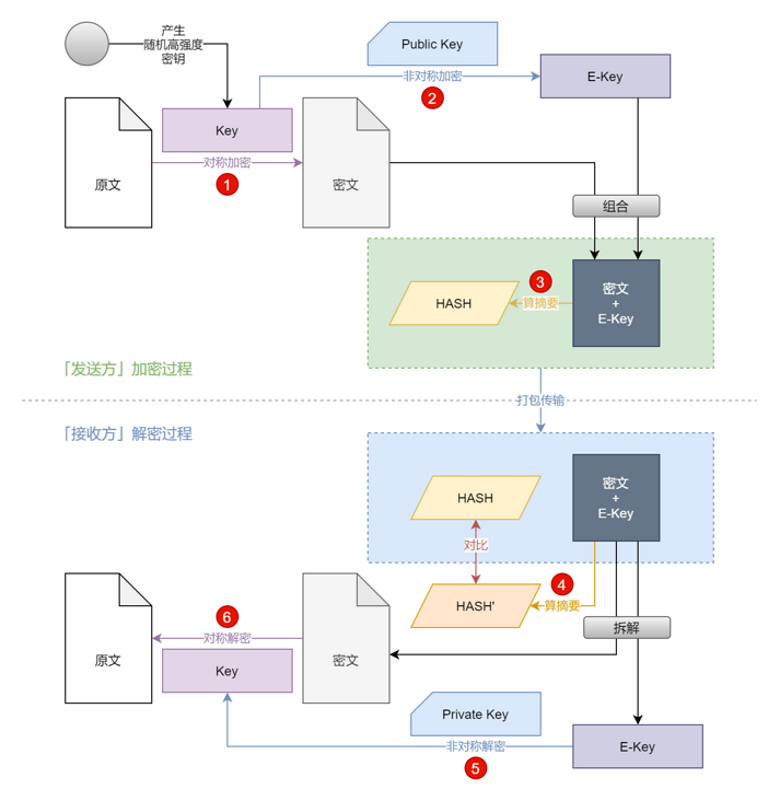 在講 JSEncrypt 之前,咱們回到“安全傳輸”這一主題。這一主題的關(guān)鍵技術(shù)在于加解密,說起加解密,那就是三大類算法:HASH(摘要)算法、對稱加密算法和非對稱加密算法?;镜陌踩珎鬏斶^程可以用一張圖來 展示: